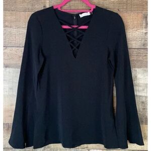 Ramy Brook long sleeve blouse. Size 2. Solid black. Criss cross neckline. Bell sleeve with a slit. Slits on the sides of the top. Back zipper. Excellent condition.