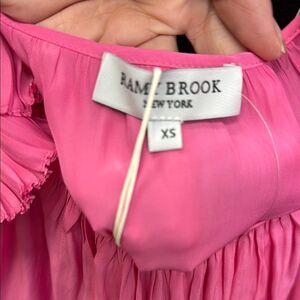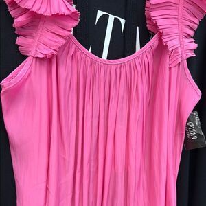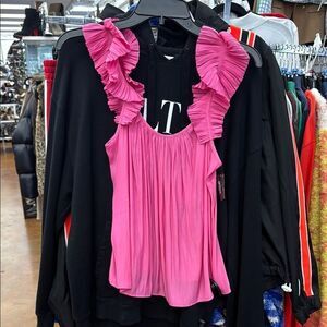 Vibrant pink blouse with ruffle details. Sleeveless design. Perfect for a chic look.In the back small stain
