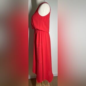 Ramy Brook's Hallie sleeveless midi-dress features a scoopneck, side patch pockets, and an elasticized waistband. A handkerchief hem adds a sweeping touch to the design. Women’s size large (8-10)