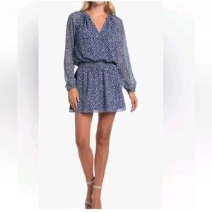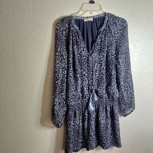Ramy Brooke Long Sleeve V-Neck Smocked Drop Waist Blue Abstract Dress sz M