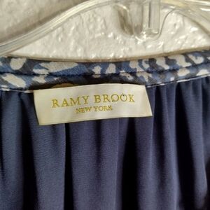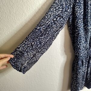 Ramy Brooke silk Long Sleeve V-Neck Smocked Drop Waist Blue Abstract Dress sz M