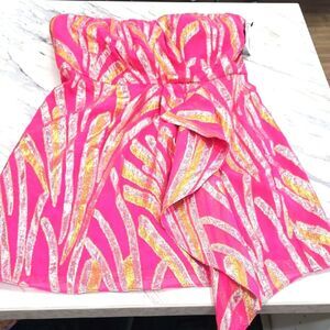 Chic mini skirt with vibrant pink and gold pattern. Stylish and eye-catching design.