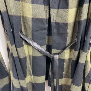 This is a long sleeve, green, black and metallic gold plaid, faux leather belt with silver tone grommet loops, lightweight jacket from Ramy Brook. Has shoulder pads. No flaws.