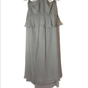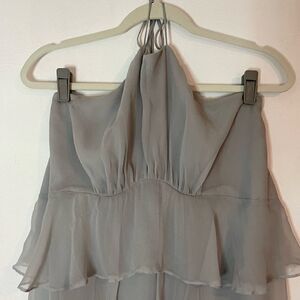 Stunning sample dress from Ramy Brook, size small. Featuring high-low hem, halter style neckline with delicate ties, empire waist with ruffle detail, fully lined.