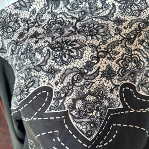 Hardly worn. Lovely shirt I just pick other colors and now it doesn’t fit. Nice soft stretchy material with real top snaps but fake lowers so it doesn’t gap. Black with lace yoke and cuffs. Lace is printed on solid fabric NOT mesh/see through
