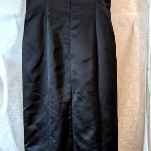 Sleek black satin dress with a chic design. Perfect for formal occasions. Good pre-owned condition. Pit to pit measurement is 17 inches and length is 57 inches. Zipper in back. Classic. CC24