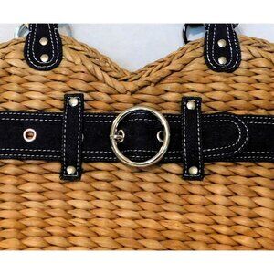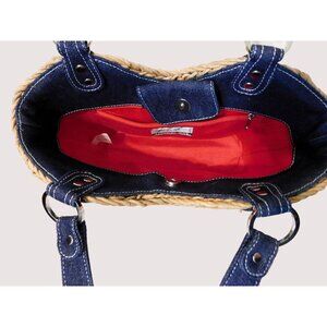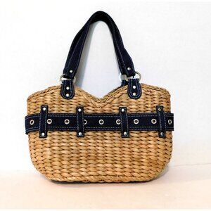 Randolph Duke The Look Straw Shoulder Bag Denim Belt Accents Blue Tan Purse