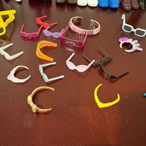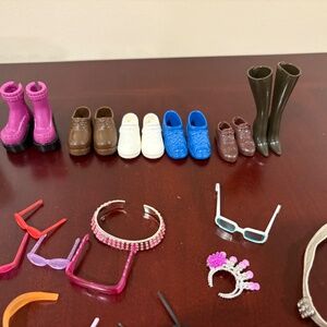 Barbie and Ken shoes and boots. Multiple pairs of sunglasses, hikers, tiaras, etc. From many Barbies over the years. 11 pairs is shoes/boots. Over 30 other pieces.