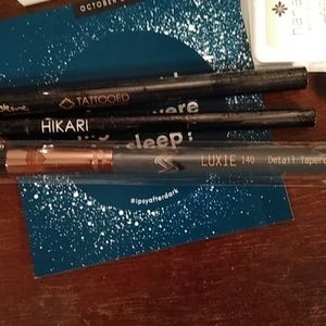 Clinique eyeshadow, Clinique Angel Red lipstick, Luxie detail tapered, hikari, skone tattooed black waterproof eyeliner, hanalei matte bronzer sample, and two nip and Fab!!!! All brand new, never used, lost one applicator from the Clinique, replaced with three more. And makeup bag!! I tried!!! Super steal. Read profile!! Please!!