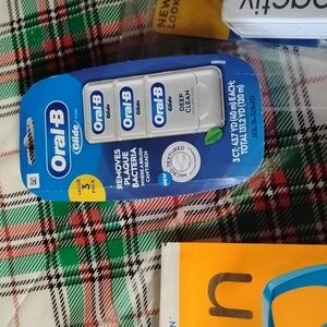 dr schools insoles, oral b floss 3 pack, mini proactive skin care, scrubbing bubbles starter pack of 2 toilet cleaning stamp. grin tongue cleaner. all new
