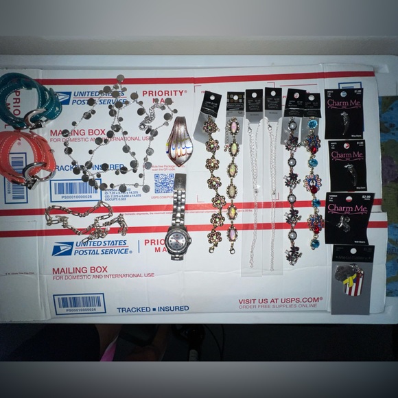 This lot has 3 Lia Sophia bracelets, a Lia Sophia necklace, a glass pendant, a women's Timex watch (just needs a battery), a women's sterling silver Herringbone necklace, 4 new charms, 2 new silver tone chains & 4 new bracelet strands!