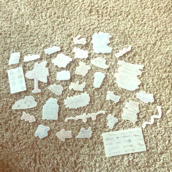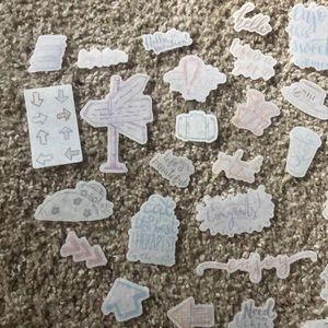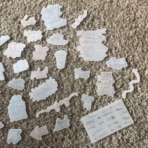 Random assortment of mini semi transparent stickers. Great quality. You will receive 31 stickers.