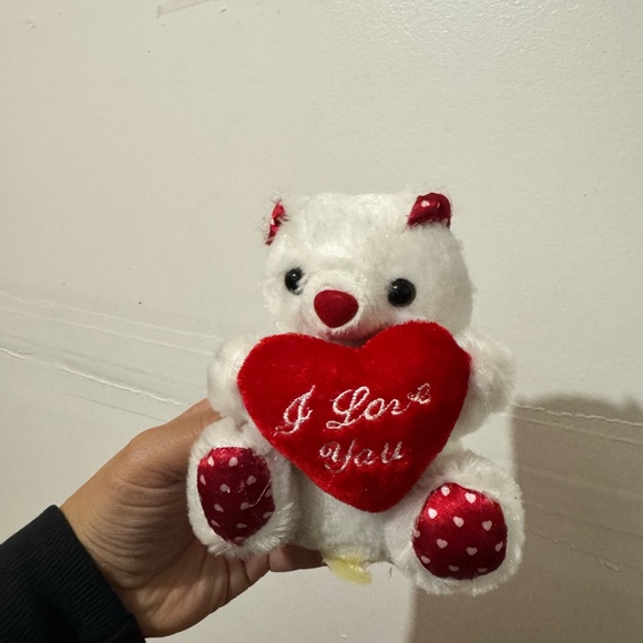 Adorable white teddy bear with red heart and accents. Perfect gift for loved ones.