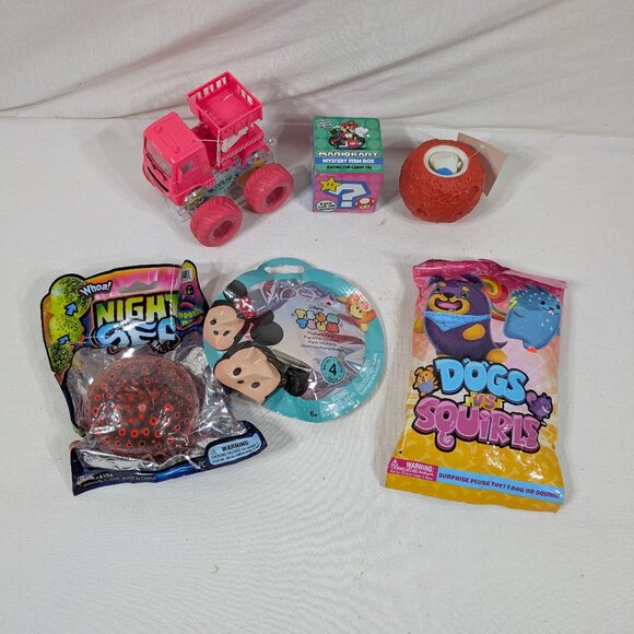 Pink monster truck showing gears to make it function, Mario mystery box, moon with astronaut popping out when you squeeze it, night see squishy ball, tsum tsum mystery pack series 4, & a dogs vs squirrels squish. All are new with tags smoke free home.
