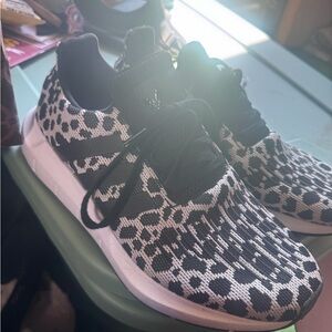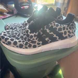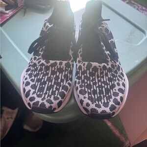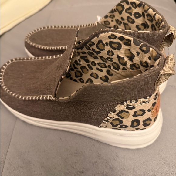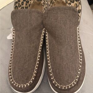 Casual slip-on mules with fabric upper. Leopard-print inner and heel panel for a bold look. Cushioned white sole for everyday wear. Easy on-and-off design with pull tab at heel.