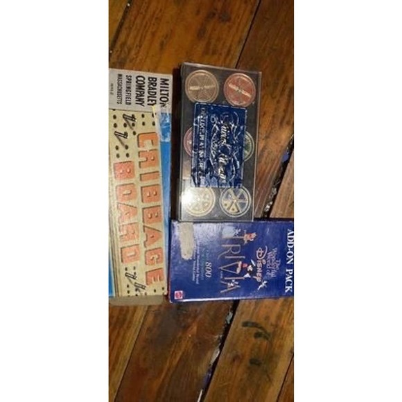 Large Disney playing cards, poker chips, cribbage board, Silverado playing cards and trivial pursuit