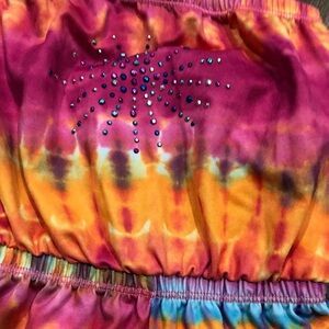 Vibrant Tie-Dye Romper with Sparkly Embellishment. This colorful romper features a lively tie-dye pattern in shades of pink, orange, purple, and blue. It has a comfortable elasticated waist and a playful shorts-style bottom. The bodice is adorned with a sparkling starburst design in blue rhinestones, adding a fun and festive touch. Perfect for a bright and comfortable statement!