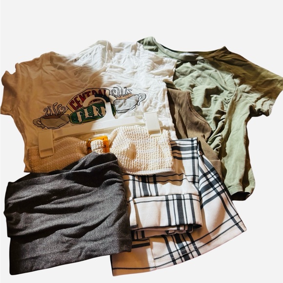 Stylish short sleeve tees in green and white, skirt sets, bikini top, etc. Junior mix of shirts and sizes xs-medium Perfect for mix and match and/ or reselling