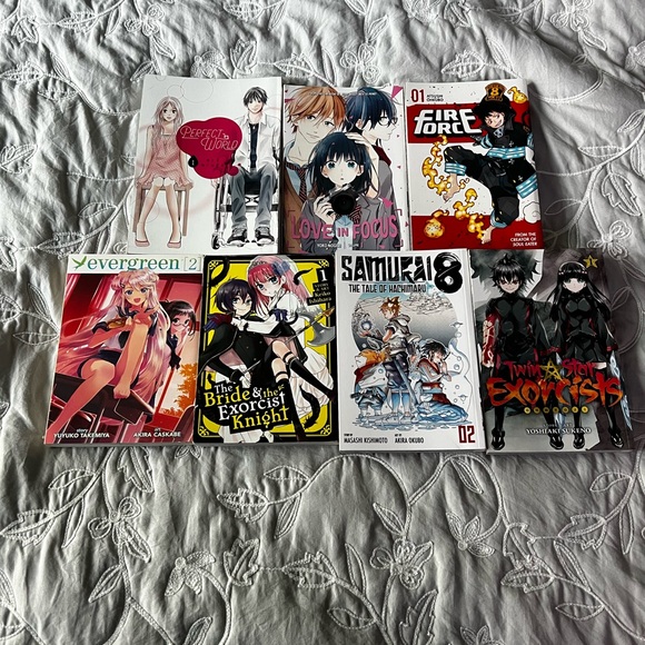 perfect world volume 1, love in focus volume 1, fire force volume 1, evergreen volume 2, the bride and the exorcist night volume 1, samurai 8 volume 2, twin star exorcist volume 1.