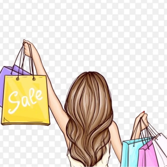 Stylized illustration of a woman holding shopping bags. Long brown hair with soft waves. Bright yellow, light blue, purple and pink shopping bags visible. Clean, modern vector art. Great for fashion listings or promotional use.