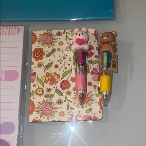 Super cute Kawaii, pens, planner, mini notepad, and sticky notes. Included with a pencil/cosmetic pouch and jewelry beads.