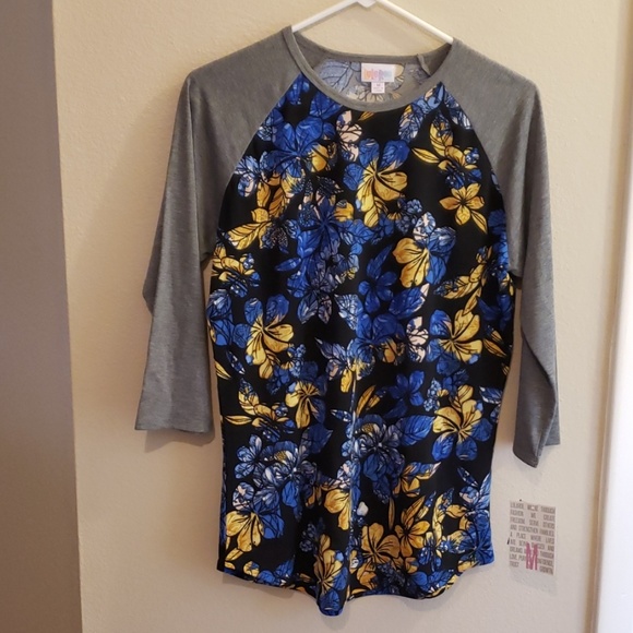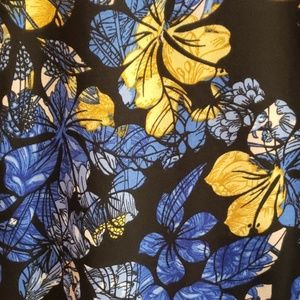 Brand new. Never worn. Black background. Blue and gold flowers. Gray sleeves.