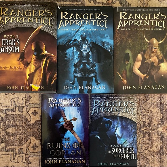 Set of five Ranger's Apprentice books by John Flanagan. Includes various covers with fantasy artwork.
