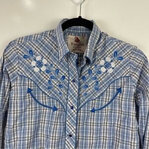 Rangers Original Blue Plaid Embroidered Button Front Western Shirt in women's size medium