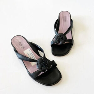 Rangoni made in Italy black all leather sandals women’s size 7.5. Floral detail with 1” heel. These are gorgeous! Preowned, very light overall wear, store sticker still attached to insole. Trendy square toe style.