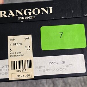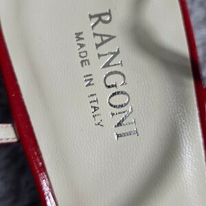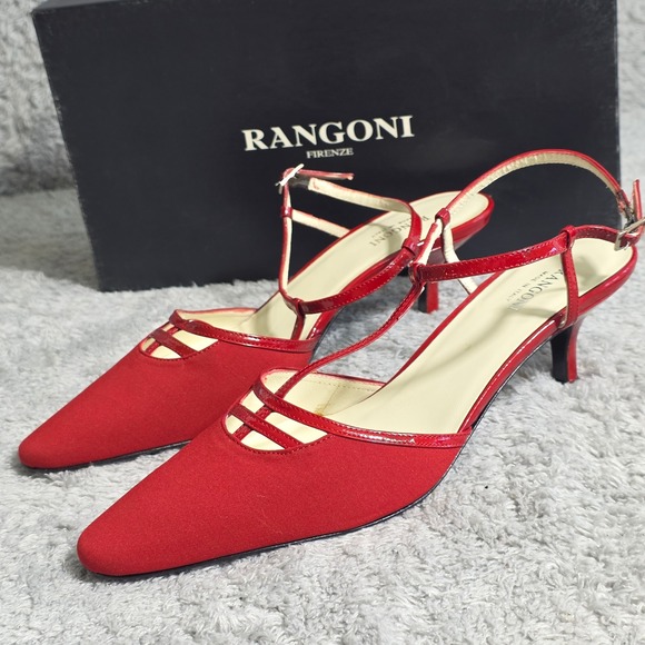 Keywords: Rangoni Firenze, Red heels, T strap heels, Pointed toe shoes, Patent leather, Made in Italy, Designer heels, Dress shoes, Evening wear, Special occasion, Classic heels, Retro style, Leather heels, Red dress shoes, Womens heels
