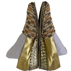Rangoni Firenze Womens Gold Metallic Weaved Leather Mini Wedge Slip On Greens Golds Cream Size 5.5. Gorgeous colors weaved across the top of the foot with metallic gold on sides and weaved leather on wedge low heel approx 1.25". Made in Italy. Please see photos for details and condition. There is some scuff/rubbing on the metallic as seen in photos. Office, business, travel or casual everyday wear.