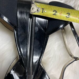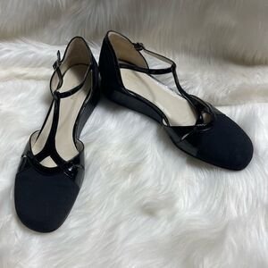 Rangoni black patent leather and nylon ankle T Strap wedge shoes size 10 .