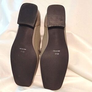 Great casual shoes that can be dressed up or down! mix of fabric and leather with a cute side buckle detail and block heel. Excellent new condition, no blemishes.