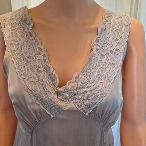 Rangoon brand. This unique & special, 100% Silk Slip style Dress with Lace, Embroidered flowers and under slip was professionally sand washed to give it a unique and distinctive Vintage feel. Size Medium. Light grey. Super Cute