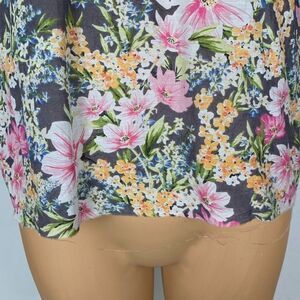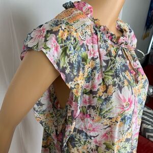 Beautiful lightweight cotton and silk floral blouse with ruffle, ties, and smocking details. So pretty and feminine! In excellent condition.
