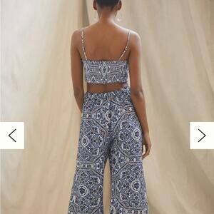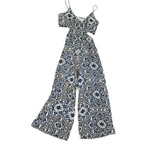 Ranna Gill Tie-Back Cut Out Jumpsuit L Boho Floral Wide Leg Smocked Resortwear
