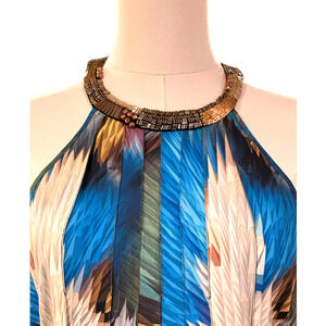 Ranna Gill Tropicalia Beaded Halter Pleated Small Satin Maxi Dress w Tie Belt