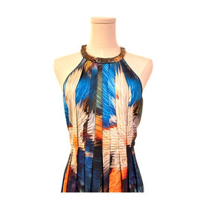 Ranna Gill Tropicalia Beaded Halter Pleated Satin Maxi Dress Small Semi Formal