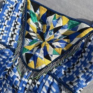 This dress is absolutely stunning. It is a sheer material with a beaded accent and embroidery on the upper chest area. From armpit to armpit it measures 14 inches and the empire waist area is around 12 inches.