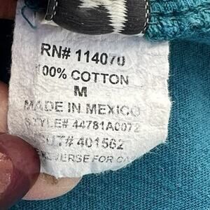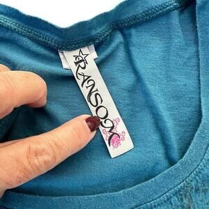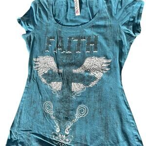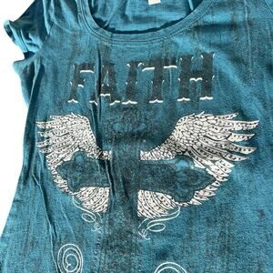 Ransom women’s size M T-shirt. Teal green short sleeves. FAITH… bedazzled cross with wings is on the front.. scoopneck and short sleeves.