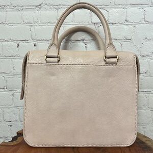 Genuine leather handbag with gold fittings. Top handle bag. Front flap compartment. Rear magnetic close. Dual sturdy roll leather handles. Zip close main compartment containing two slip pockets and one slim zip close pocket. Light blush pink.