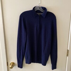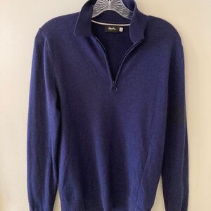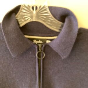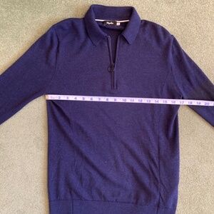 Polo style collar with zipper pull. This is a clear navy (some photos color is off). 100% wool.