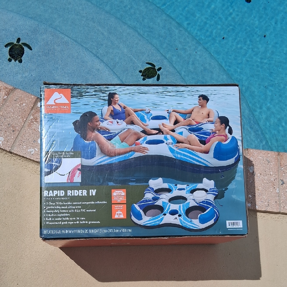 Enjoy the water with the Rapid Rider IV. Features a blue and white design. Perfect for group relaxation. Fits 4, with 4 built-in cupholders. Plus, it has a built-in cooler that holds up to 24 cans. Hardware features a wraparound grab rope with built-ingrommets. New in box.