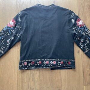 Rapsodia is an Argentinian brand with a flair for bohemian accents. Pictures don't do this jacket justice. It's made of 100% cotton and features embroidery, beading and sequins and a hidden set of hook and eye closures in the event you want to wear this buttoned. There is one small sequin missing from the right sleeve, which is pictured in the photos but it's not noticeable. This is very on trend for fall's romantic vibe. Measures 19" pit to pit, 23" from shoulder to hem and 12" from pit to wrist. Comes from a smoke and pet-free home.