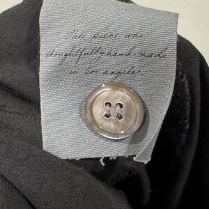 Black satin, 100% rayon, made in the USA, mother of pearl single button closure, extra button included, collared, unstructured, functional front fold over pockets, formal, professional, cocktail, NYE, holiday