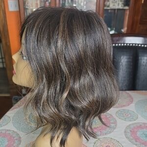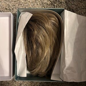 Elevate your look with this stylish brown wig. Perfect for any occasion, it offers a natural appearance and comfortable fit. This wig is in excellent condition with no flaws. I believe the color is Iced Cafe Latte