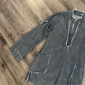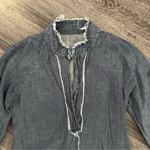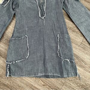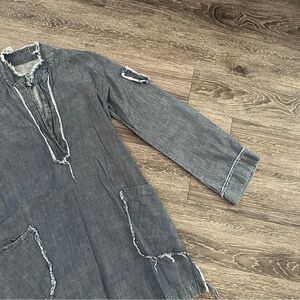 A cool, slouchy short chambray denim dress thats been given the frayed edge treatment around the big patch pockets and the front deep v tunic placket and collar. Wear the long, loose shirt sleeves down or button them up with a sleeve rolling tab that untraditionally buttons to the cuff, creating a unique sleeve drape. Color: Chambray
