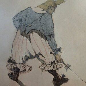 Immerse yourself in the vibrant Parisian nightlife with Henri de Toulouse-Lautrec's Clown Trainer, an authentic antique lithograph that captures the essence of French artistry. This piece, a testament to Lautrec's mastery, offers a glimpse into the bustling world of entertainment through its richly detailed imagery and bold use of color. Perfect for collectors and enthusiasts of historical art, this lithograph is a reproduction of the original artwork that Lautrec created during his illustrious career. It brings a touch of vintage elegance and historical context to any setting, making it a valuable addition to your collection or as a standout piece in your living space. The item is 10" x 17", frame will not be included.