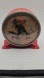 The red metal case is in very nice condition with some surface wear and scratches. The watch features independently winding mechanisms for the clock and alarm. It has a 12 hour dial that does have some fading. The dial also features the phrase Who's Afraid Of The Big Bad Wolf, the 3 Little Pigs and the colorful Big Bad Wolf that has an animated head with the mouth opening and closing and animated arms and hands. There is some paint chipping and lose to the Wolfs arms and hands.