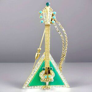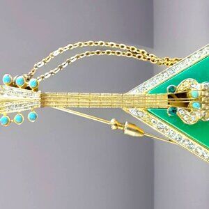 Measuring 3 inches in length, the striking colors of green, turquoise, clear rhinestones and bead accents are especially rare in this design. The triangular shape and cabochon green main stone give it a distinctive look, while the yellow gold tone finish adds a touch of elegance. The intricacy of the guitar is impressive, showcasing the detailed jeweled face with the 3 guitar strings and hollow design of the body of the instrument. This exquisite piece of jewelry would make a lovely unique gift for an anniversary, birthday, wedding or any special occasion. It is a perfect piece for collectors or those looking for a statement piece to add to their jewelry ensemble.
